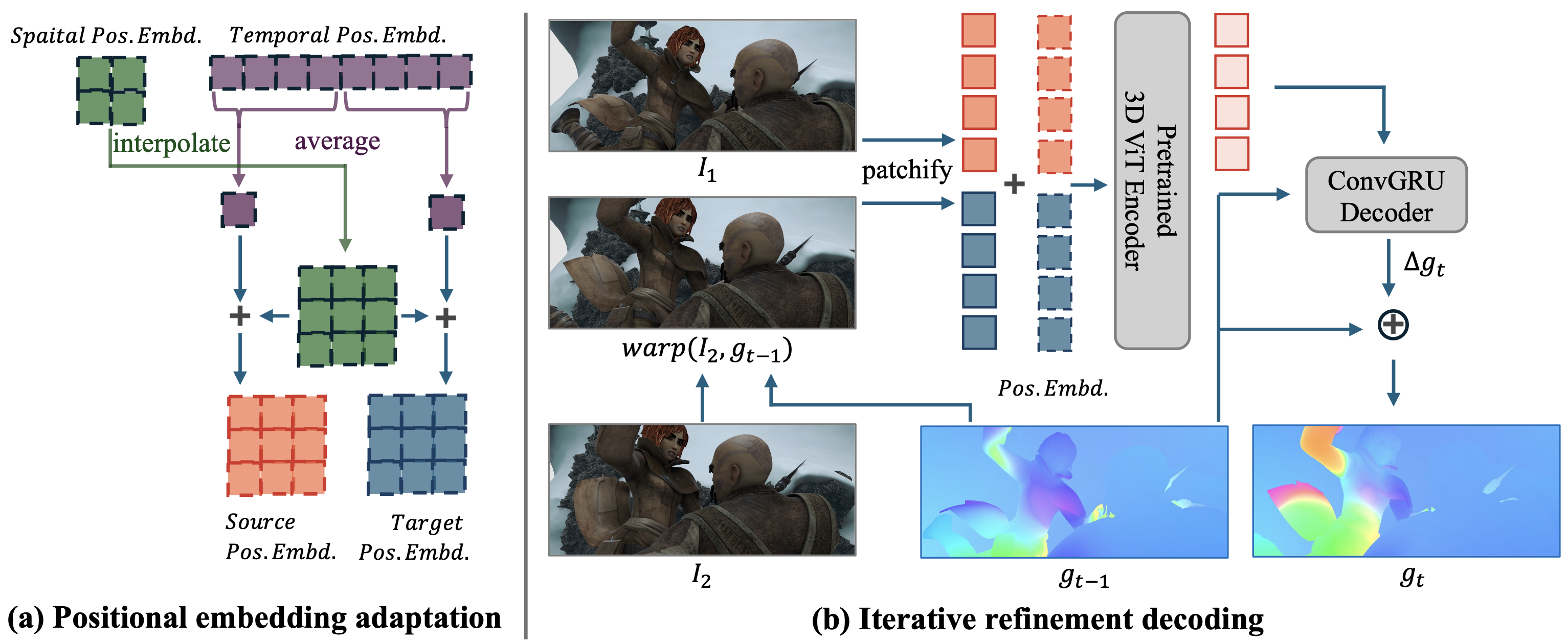 Our work transfers the encoder in video foundation models to multi-view geometry tasks. Any video foundation model whose encoder follows a transformer architecture can be used. To process the video data, the transformer splits the spatio-temporal data into 3D patches, adds spatial and temporal positional encodings, and then feeds the visual tokens into the self-attention blocks. To adapt pretrained 3D ViTs for two-frame tasks, we first interpolate the 2D spatial positional encodings to match the desired input size in the fine-tuning stage. See Figure 1(a) for a visualized demonstration.