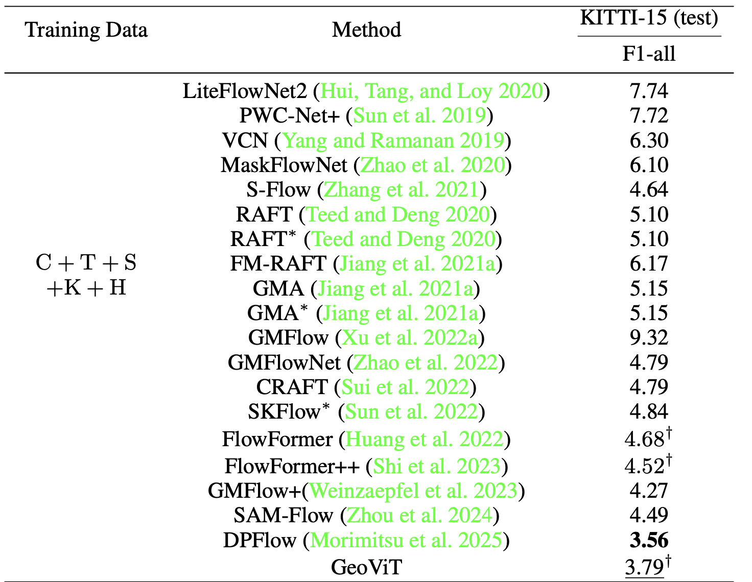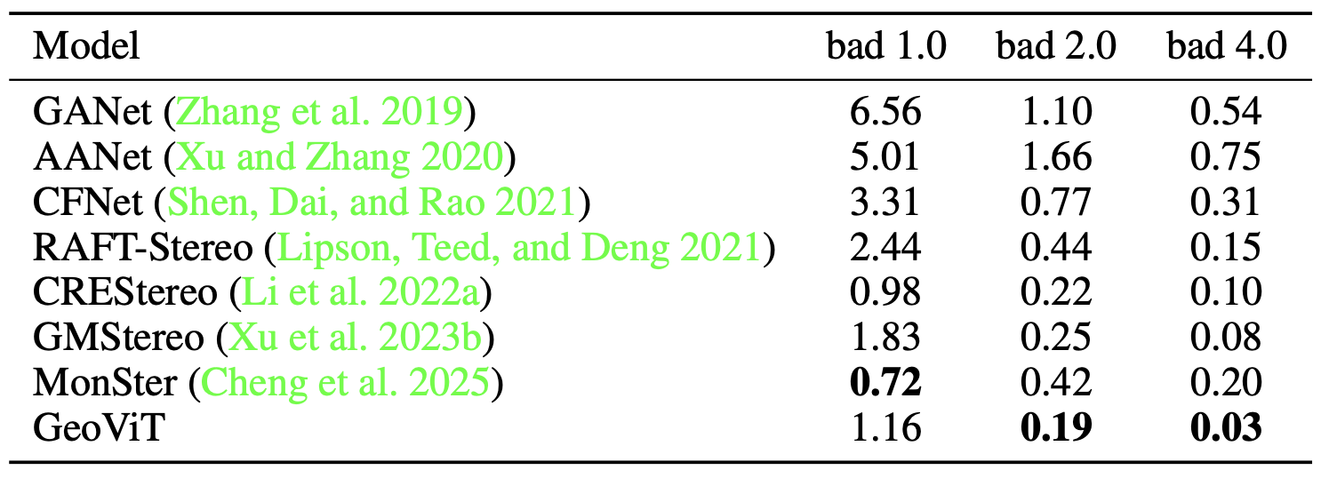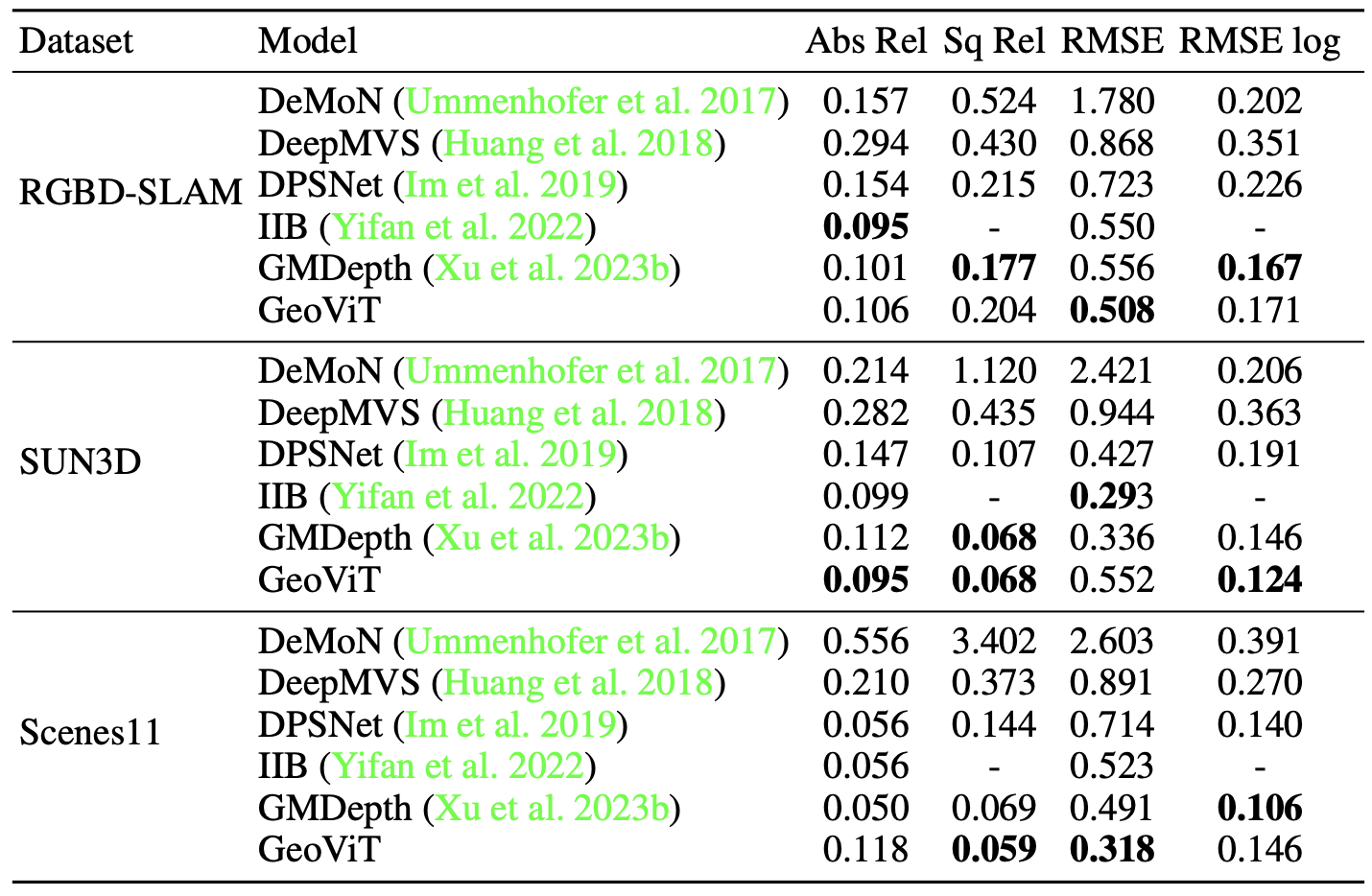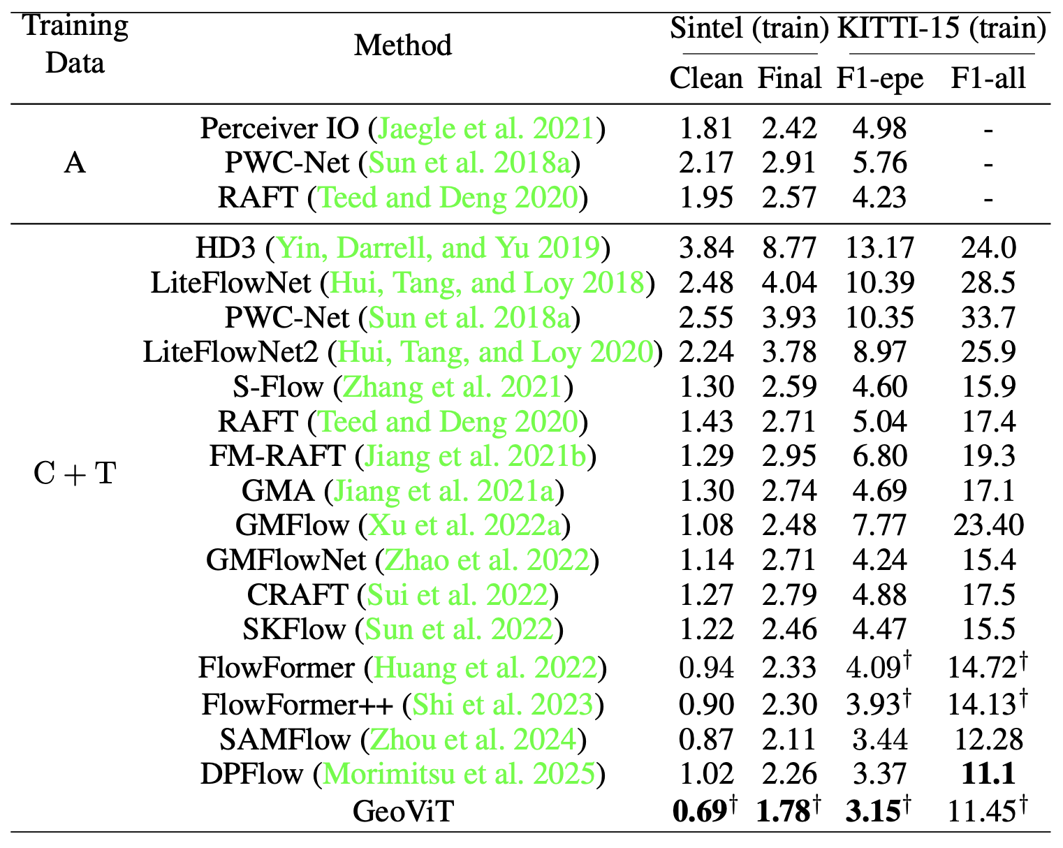 where \(F_{\text{enc}}\) denotes a spatiotemporal ViT that takes (warped) image pairs as input and returns features corresponding to source images. The source image features together with the current prediction are fed to the decoder \(F_{\text{dec}}\) to predict the residuals. The decoder is instantiated as a ConvGRU unit following RAFT. The warping operation takes an image as input and outputs another image according to the geometrical property \(g_{t-1}\). The warping operation for optical flow estimation and stereo matching is straightforward. For 3D depth estimation, we first convert the depth representation to pixel displacement using camera parameters, and convert the prediction results back to depth. The predicted residual is then aggregated with the prediction of the previous step. See Figure 1(b) for a demonstration.